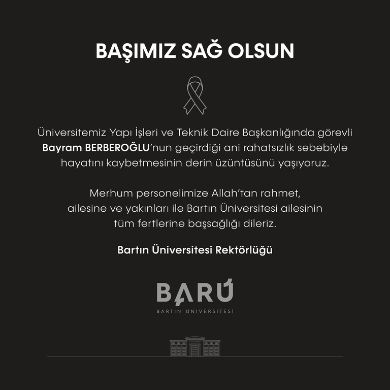 Merhum personelimize Allah'tan rahmet, ailesine ve yakınları ile Bartın Üniversitesi ailesinin tüm fertlerine başsağlığı dileriz.