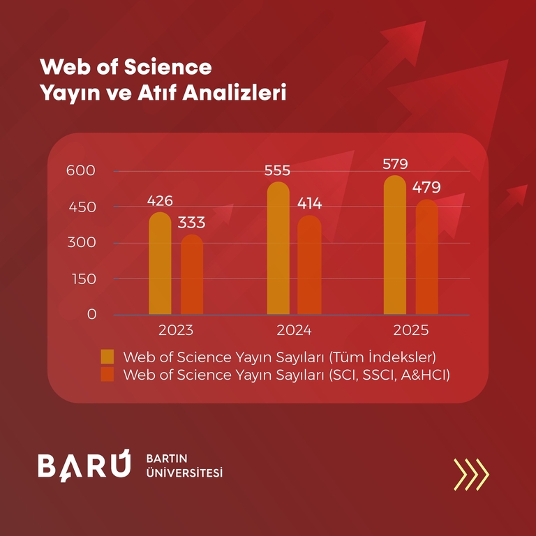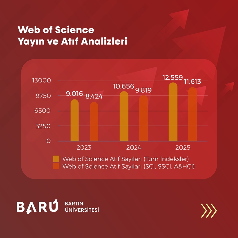 BARÜ’nün, WoS kapsamındaki tüm indekslerde toplam atıf sayısı 2023’te 9.016 iken, 2024’te 10.656’ya ve 2025’te 12.559’a yükselerek 3 yıllık dönemde 3.543 artış kaydetti. WoS çekirdek indeksleri (SCI, SSCI, A&HCI) özelinde ise toplam atıf sayısı 2023’te 8.424, 2024 yılında 9.819 iken 2025’te 11.613’e çıkarak 3.189’luk bir artış gösterdi.
