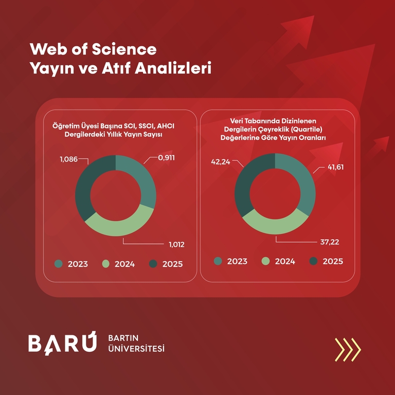 BARÜ, Web of Science verilerine göre 2023-2025 döneminde toplam yayın sayısında 153 artış gösterdi. Buna göre artış oranı yaklaşık %35,9 oldu. Çekirdek indekslerde (SCI, SSCI, A&HCI) yayın sayısı 2023’te 333, 2024’te 414 ve 2025’te 479 olarak açıklandı. 2025 yılı itibarıyla çekirdek indekslerdeki yayın sayısı, 2023 yılına kıyasla 146 artarak yaklaşık %43,8’lik ilerleme kaydedildi. Öğretim üyesi başına düşen yıllık yayın sayısı 2023’te 0,911, 2024’te 1,012 ve 2025’te 1,086 olarak hesaplandı. Böylece 2023’e göre öğretim üyesi başına düşen yayın sayısında 0,175’lik bir artış görüldü. Dergi kalitesini yansıtan çeyreklik dağılımlarında ise Q1 dergilerde yayımlanan yayınların oranı 2023’te %41,61, 2024’te %37,22 ve 2025’te %42,24 olarak belirlendi.