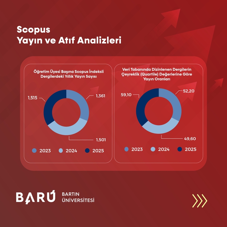 Scopus veri tabanına dayalı göstergelerde BARÜ, benzer bir yükseliş ortaya koydu. Scopus’ta dizinlenen dergilerde yayımlanan toplam yayın sayısı 2023 yılında 490 iken, 2024'te 605'e, 2025 yılında ise 668'e yükseldi. Toplam yayın sayısındaki artış oranı son 3 yılda %36,3 oldu. Öğretim üyesi başına düşen Scopus indeksli yıllık yayın sayısı 2023’te 1,361 iken 2024’te 1,501’e, 2025’te ise 1,515’e yükseldi. Q1 dergilerde yayımlanan yayınların oranı ise 2023’te %52,20, 2024’te %49,60 ve 2025’te %59,10 olarak hesaplandı.