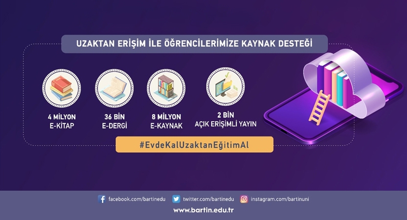Bu kapsamda 17 bini aşkın öğrencisine 536 öğretim elamanıyla ‘Uzaktan Eğitim’ verildiği Üniversitemizde milyonlarca bilimsel yayın da sadece bir tık uzağa taşıdı. Bu yayınlara ulaşmak isteyen kullanıcıların bilgisayarları ya da akıllı cihazları üzerinden “http://kutuphane.bartin.edu.tr” adresine girmeleri ve kayıt olarak elektronik yayınlardan yararlanmaları mümkün.